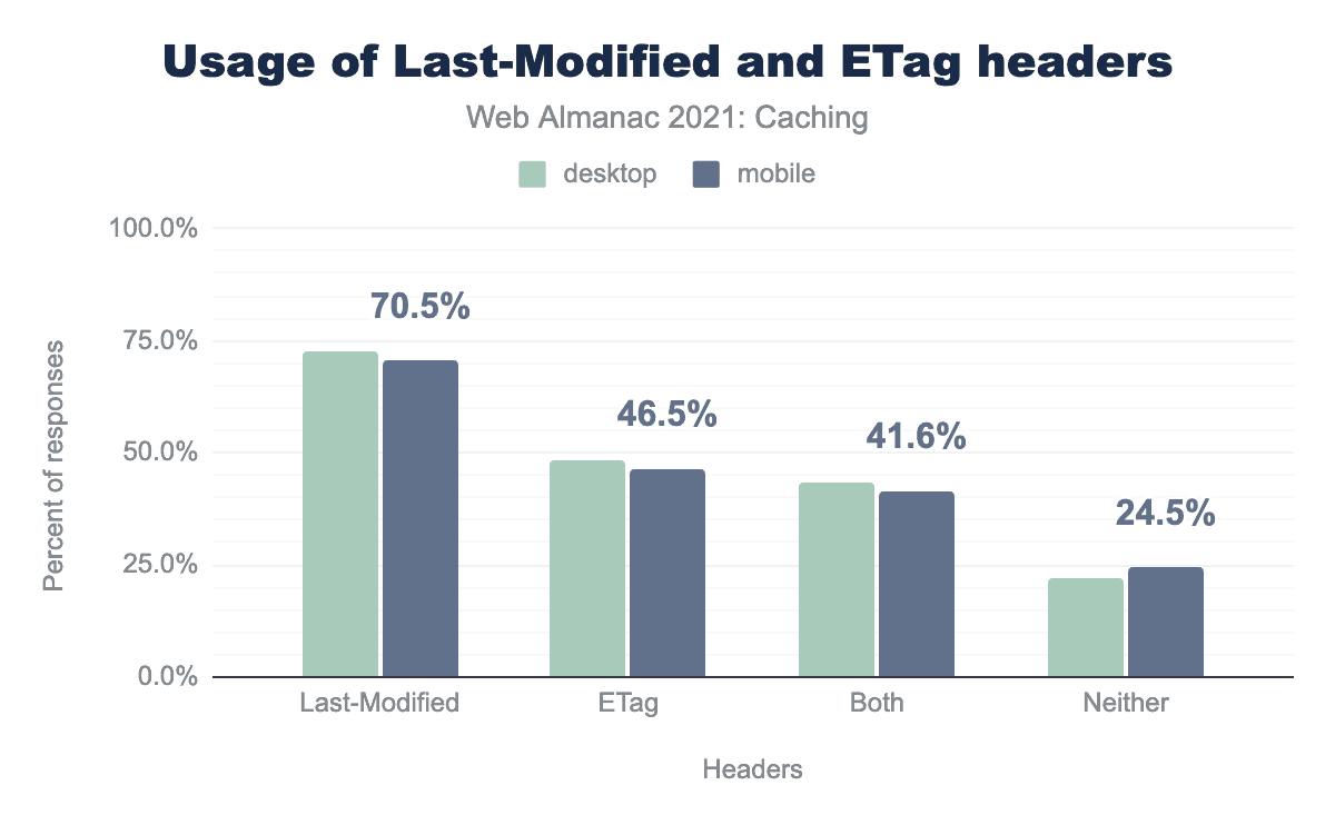 Last-ModifiedとETagヘッダーの使用率を示す棒グラフです。デスクトップとモバイルで70.5%が Last-Modified を、46.5%が ETag を、41.6%が両方を、そして24.5%がどちらも使っていません。Last-Modified と ETag ヘッダーを設定したレスポンスのパーセンテージ。