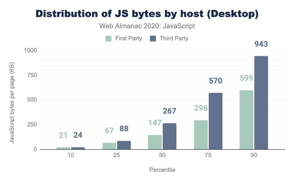 Hoewel het aantal JavaScript-verzoeken vergelijkbaar is bij de mediaan, wordt de werkelijke grootte van die scripts iets zwaarder gewogen (bedoelde woordspeling) ten opzichte van bronnen van derden. De gemiddelde site stuurt 267 KB JavaScript van derden naar desktopapparaten, vergeleken met 147 KB van eerste partijen. De situatie is vergelijkbaar op mobiele apparaten, waar de mediaan-site 255 KB aan scripts van derden verzendt, vergeleken met 134 KB aan eigen scripts.